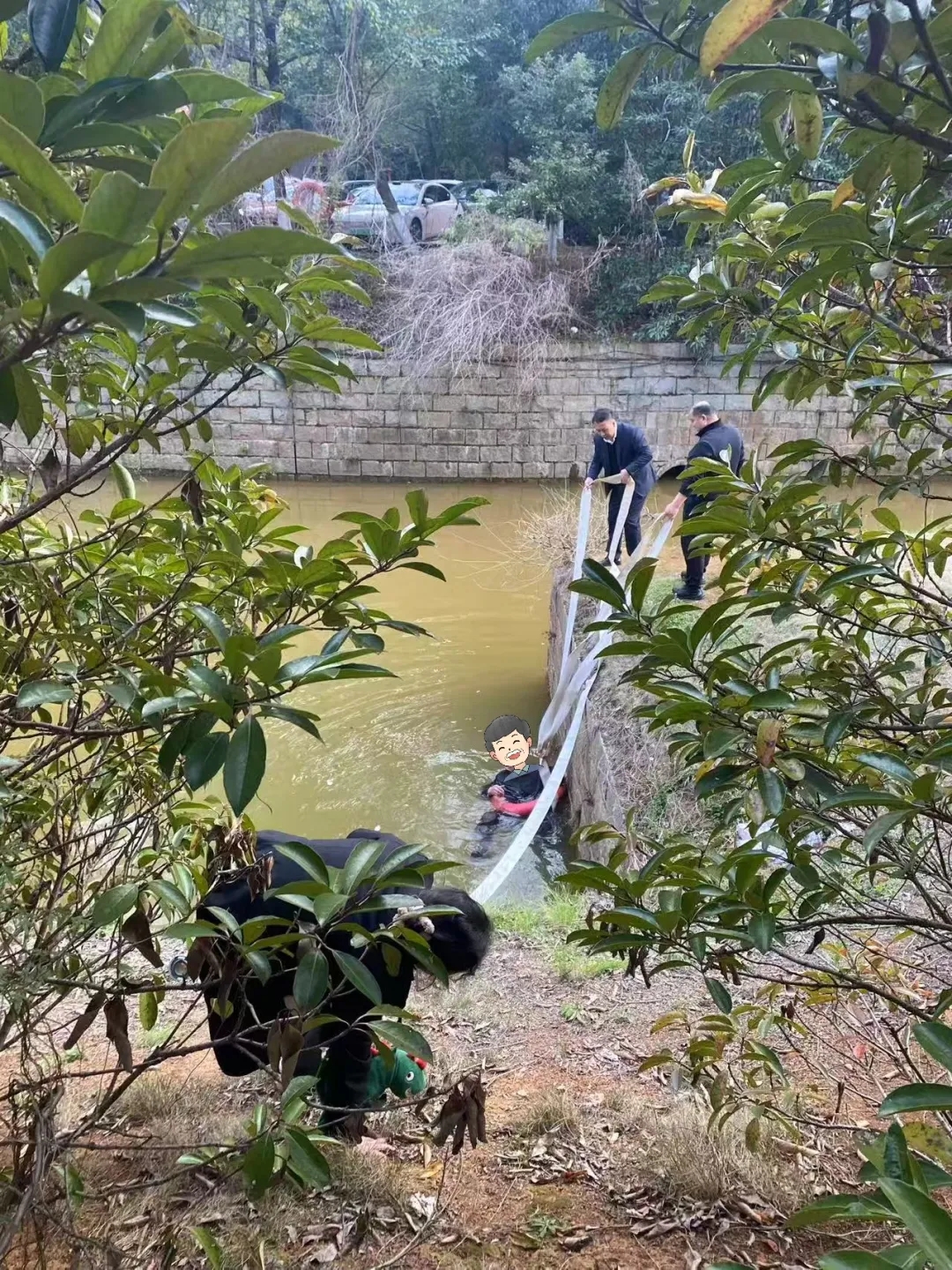 “太陡了,根本下不去!”“快想办法!”众人心急如焚。时间就是生命!大家迅速分工,沿河堤奔跑寻找有利地形。“这边有个缺口!”有人发现一处地势相对较低的小豁口,可以接近水面。众人立即集结于此。有人拨打110、120,清晰报告位置;有人抱起路边的救生圈,瞄准老人奋力抛去;有人找来长竹竿伸向水中,大声呼喊:“抓住竿子!”但2米多高的垂直落差,仅靠竹竿根本无法将老人拉上来。老人浑身湿透,衣物吸水后格外沉重,加上体力不支,根本无法配合用力。